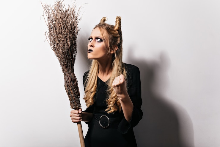 Для создания более соблазнительного образа можно использовать чулки или сетчатые колготки. При этом важно, чтобы они были черными. Эти изделия отлично смотрятся с туфлями или сапогами на высоком каблуке. В качестве стильного акцента в ансамбле допустимо использование метлы. Подойдет швабра или веник.