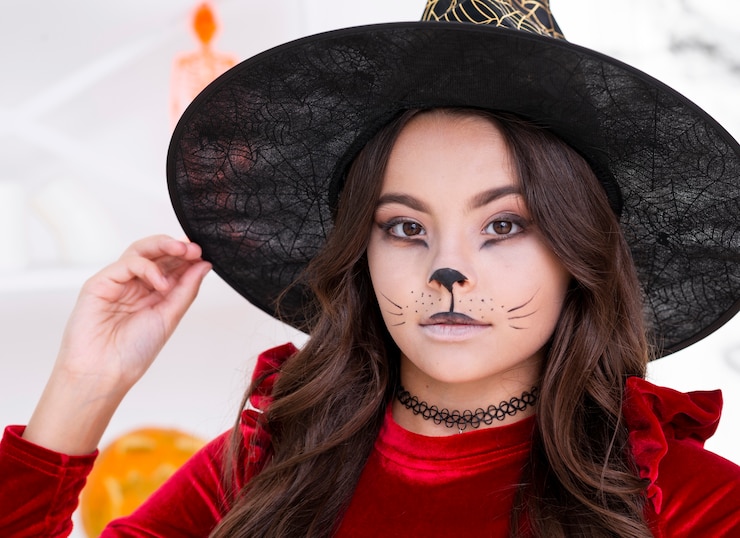 Осталось нанести макияж. Для этого понадобится персиковый тональный крем, который поможет выделить румянец. Макияж в стиле Smoky eyes и накладные длинные ресницы подчеркнут глаза. Для губ потребуется красная помада. В завершение на носу рисуют треугольник и усы.