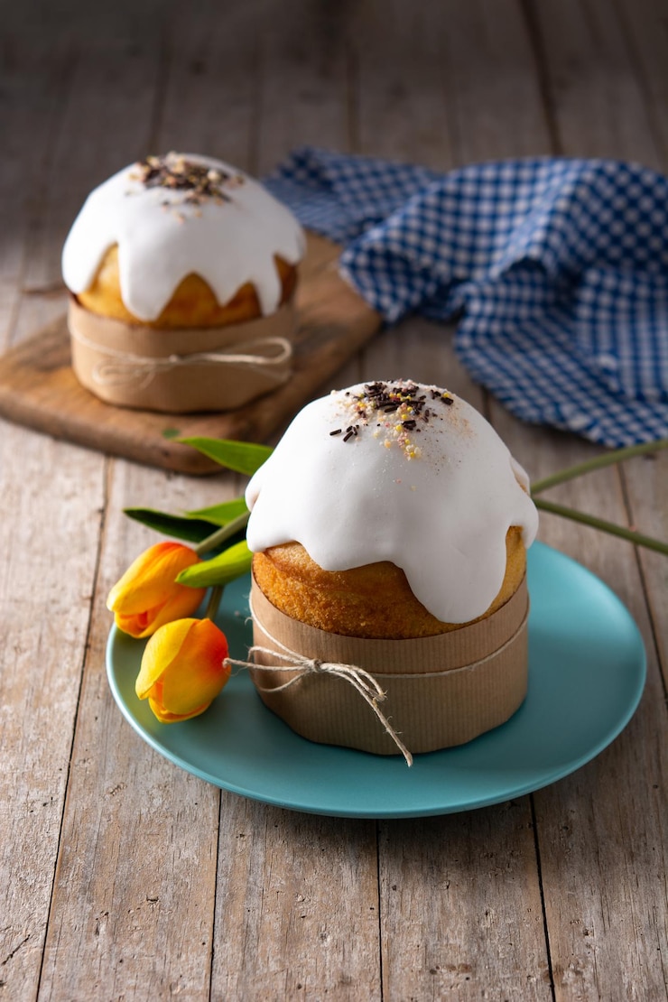 - Готовые пасхальные куличи с творогом, приготовленные без дрожжей, покрываем глазурью, а затем посыпаем кондитерской стружкой.