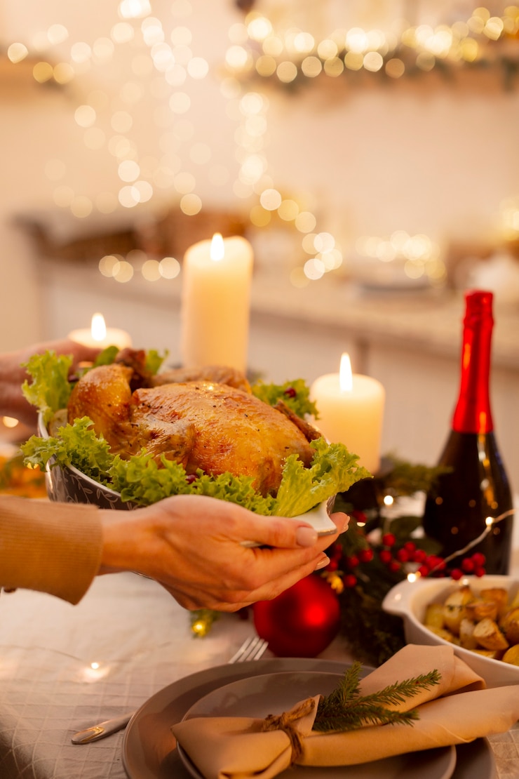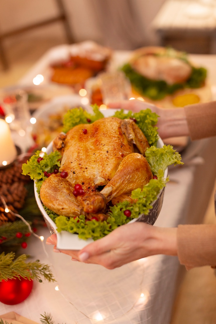 - Готовую птицу нужно извлечь из духовки и поместить на большое блюдо вместе с картофелем.