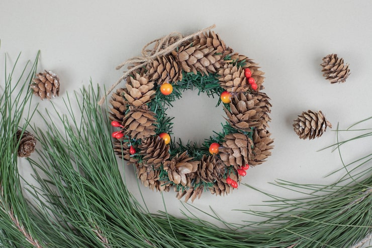 Новогодний венок можно изготовить самостоятельно, используя не только еловые ветви, но и сосновые шишки. Это позволит создать эффектный, привлекательный и экономичный декор к Новому году.
