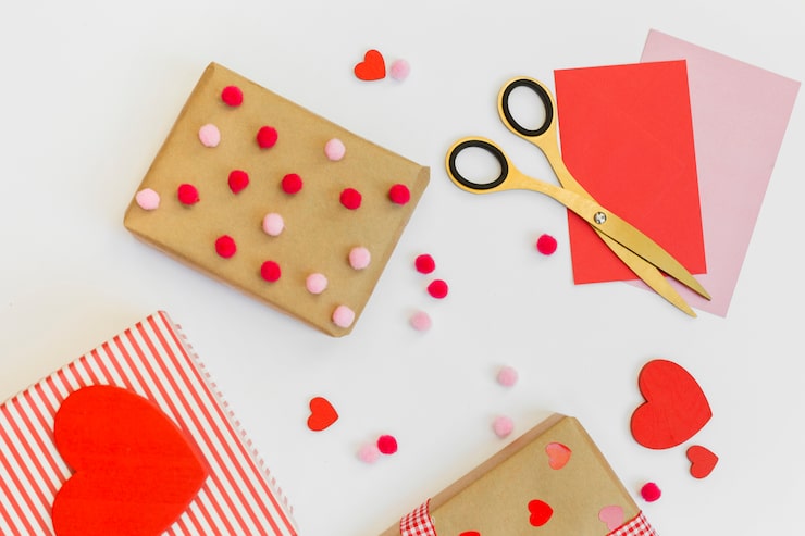- Заготовим сердечки различной расцветки и габаритов. Соединяем их между собой, следуя примеру на фотографии, и приклеиваем к внутренней стороне подарочной коробки, расположенной внутри открытки.
