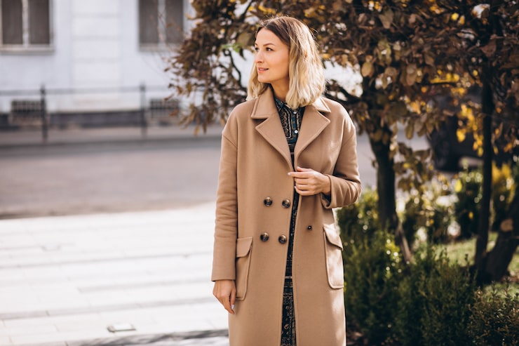 «Пальто, выполненное в стиле «халат», не просто удачно акцентирует талию, но и придает облику очарование и изящество, даже в сочетании с массивными ботинками или спортивной обувью. Отличительной чертой этой модели является отложной воротник, создающий выразительный вырез на груди.
