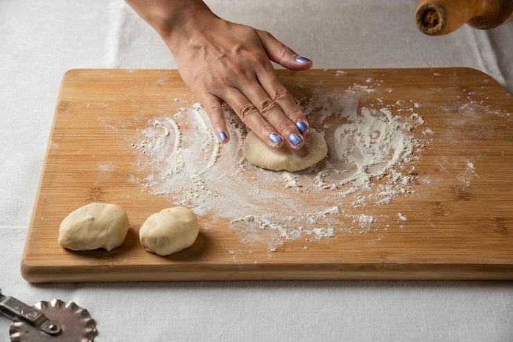 - Тесто помещают на рабочую поверхность и вымешивают до тех пор, пока оно не приобретет эластичную и мягкую консистенцию, а также перестанет прилипать к рукам.