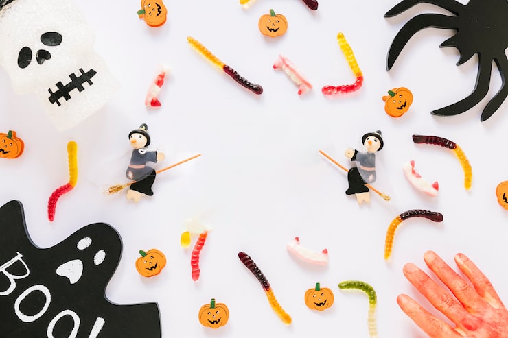 На Хэллоуин в западных странах существует традиция угощать сладостями. В связи с этим, к праздничному оформлению можно подойти творчески, не ограничиваясь только поделками. Рекомендуется разработать оригинальное меню, которое будет одновременно пугающим, зловещим и аппетитным, а также испечь вместе с детьми тыквенный пирог.