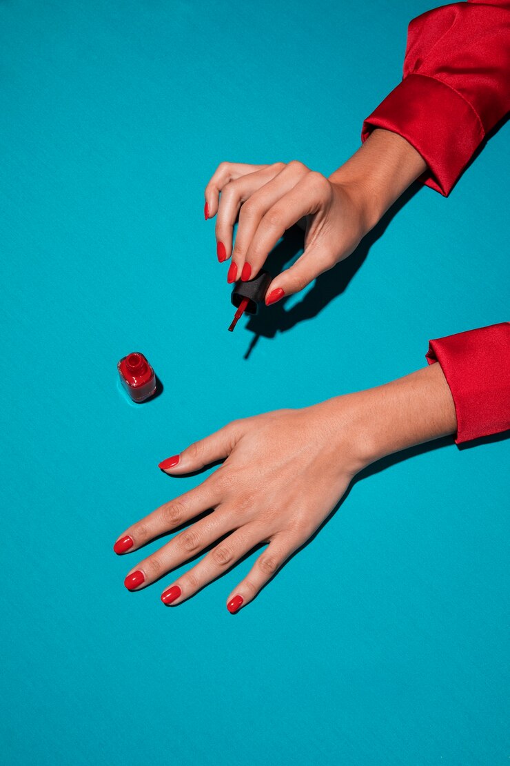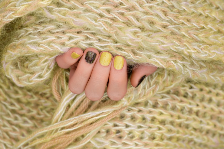 Каждому ногтю придается отдельный, однотонный цвет. Важно поддерживать согласованность между дизайном ногтей на одной руке и на другой: если, к примеру, ногти левой руки окрашены в фиолетовый цвет, аналогичный оттенок следует использовать и на правой руке.