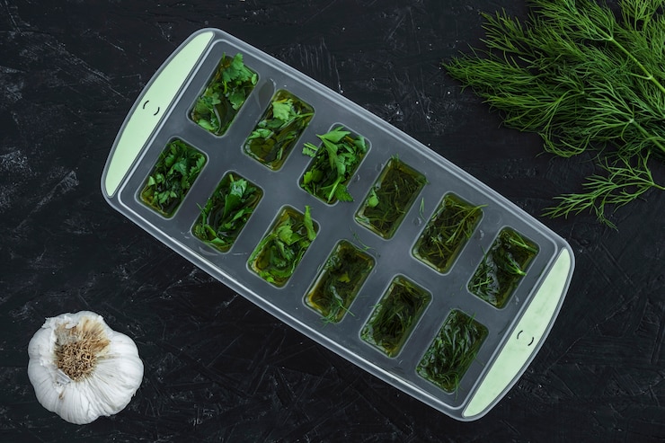 Для сохранения полезных веществ и яркого зеленого цвета сока шпината, рекомендуется замораживать его в виде кубиков льда. Процесс выглядит следующим образом: