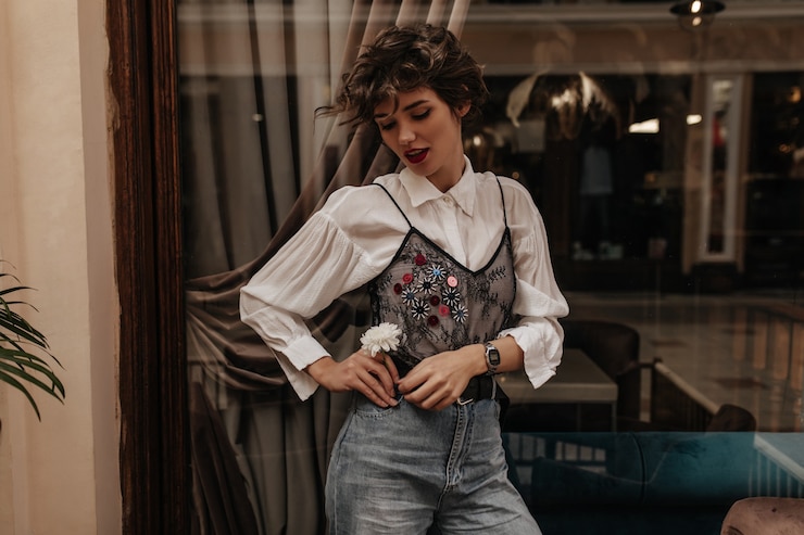 Джинсовые рубашки обладают непринужденным стилем, однако их также можно носить, заправив один край в юбку или брюки, расстегнув верхние пуговицы и спустив воротник с плеча.