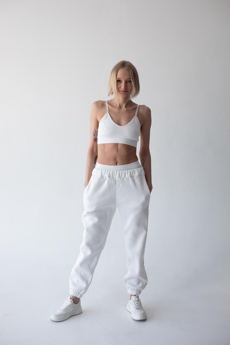 Отличительной чертой этих женских брюк является их заметный мужской стиль и декоративные карманы.