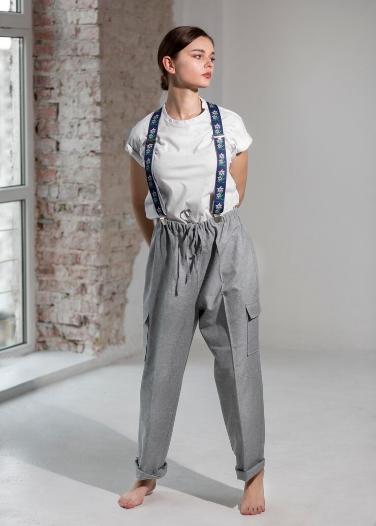 Брюки доступны в вариантах полной и укороченной длины, свободного или прилегающего кроя, а также в классическом или милитари стиле. Они хорошо сочетаются с топами стандартной длины, акцентирующими бедро, или с укороченными моделями.