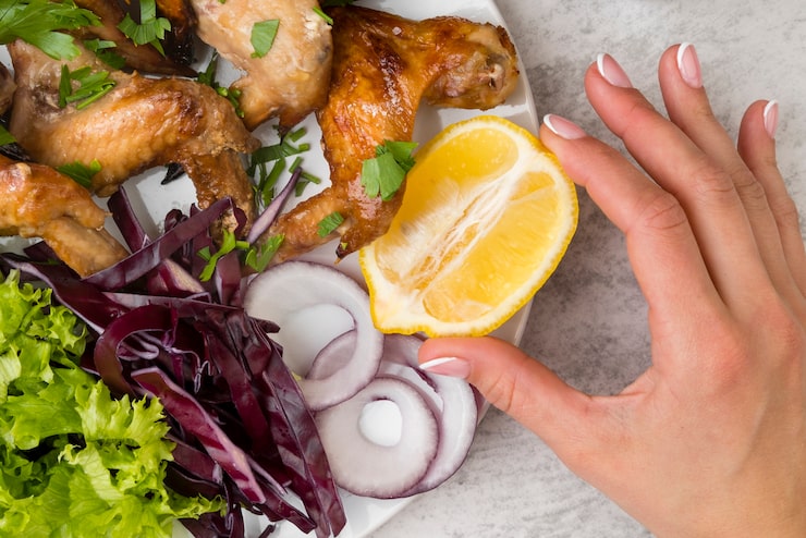 - Запеченная куриная грудка, лишенная кожи, с добавлением лимона и зелени.