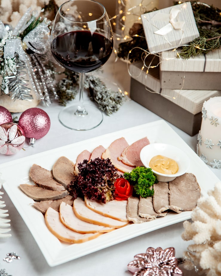 - Подача. Выньте ветчину из духовки и дайте ей немного остыть в течение 15-20 минут. Переложите на блюдо для подачи и украсьте свежими веточками розмарина, дольками апельсина или зернами граната. Нарежьте тонкими ломтиками и сервируйте с вашими любимыми гарнирами.