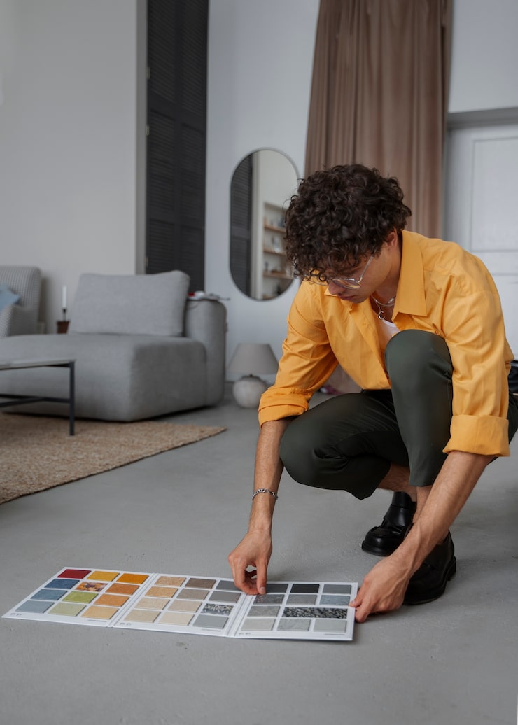 - Экспериментируйте с образцами. Прежде чем приобретать краску или обои, рекомендуется приобретать образцы и оценивать их сочетаемость с напольным покрытием и мебелью при разном освещении.