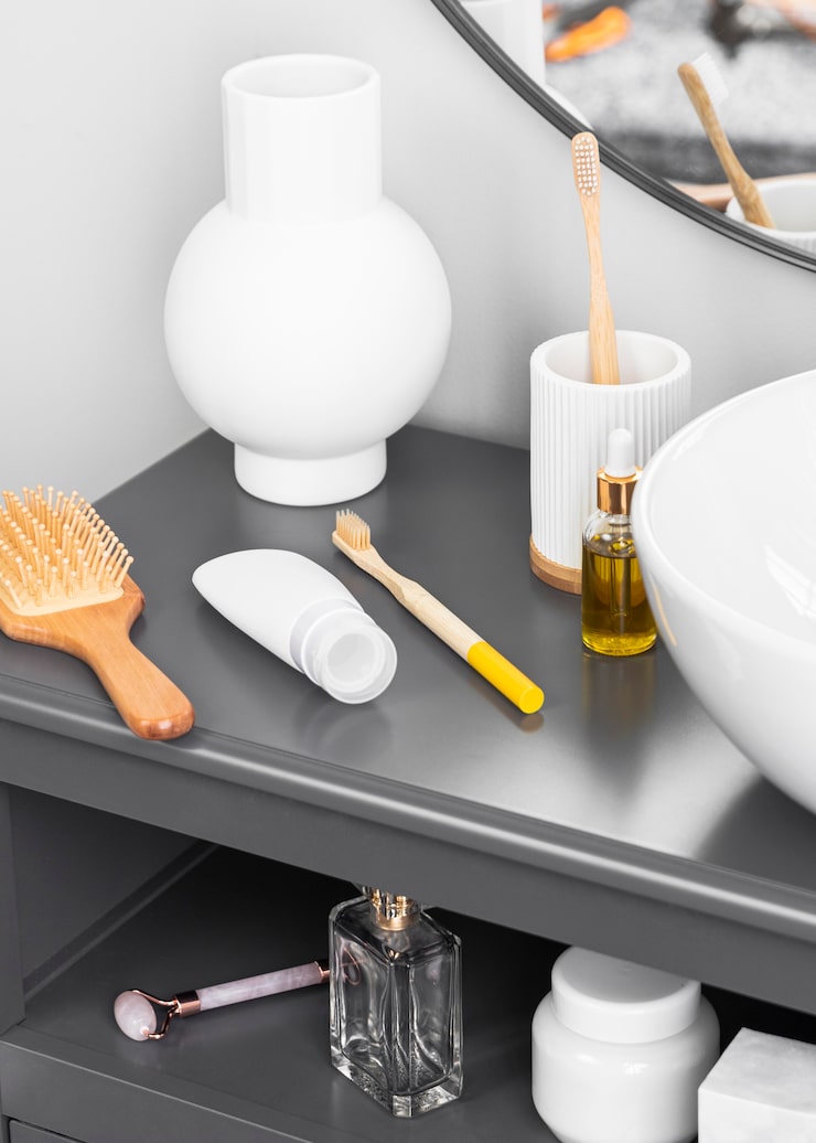 Самый простой способ перестать чувствовать, что ты живешь в отделе тестеров магазина косметики – сгруппировать все по зонам. Маленькие подносы или блюдца отлично с этим справятся, если на них поставить уход, который ты используешь каждый день. Кремы, масло, сыворотка, спрей для лица – все на месте, ничего не расползается по поверхности.