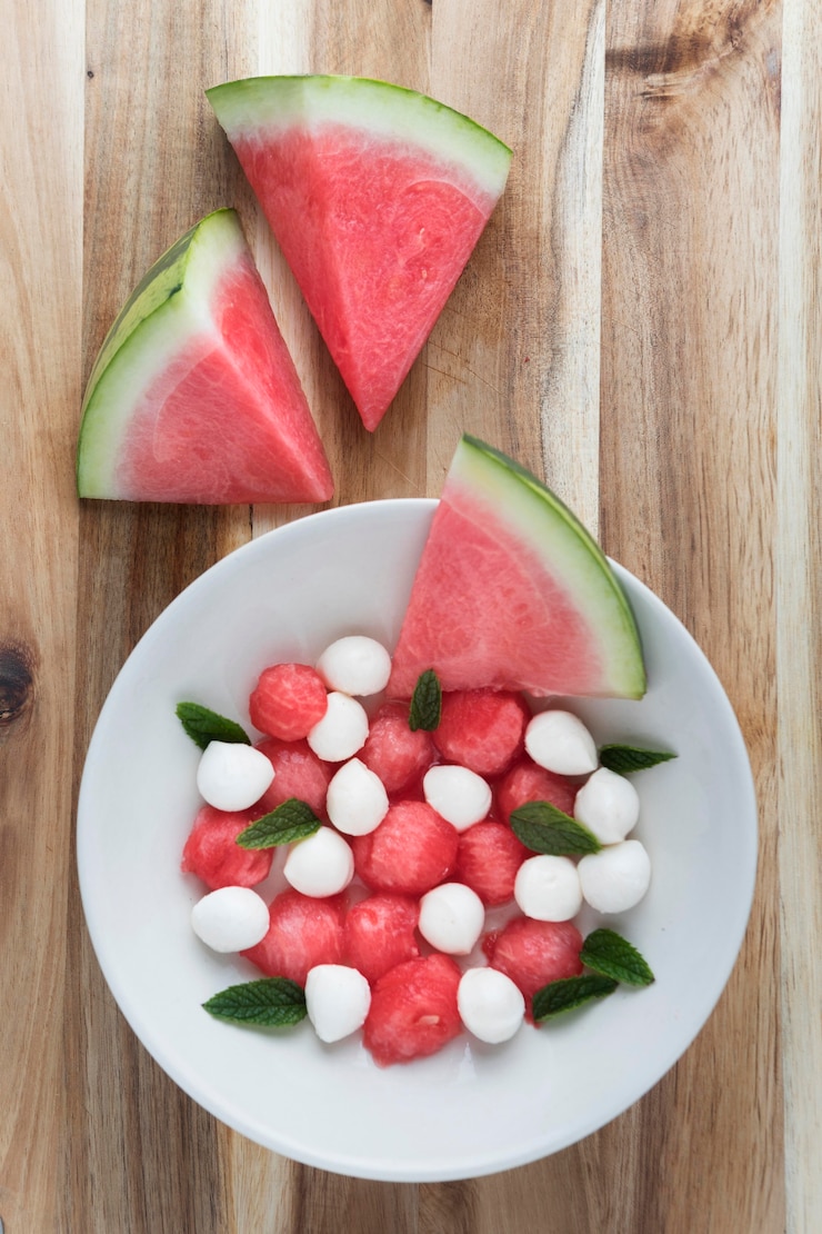 Классика, которая давно прижилась в летнем меню. Сладость арбуза отлично сочетается с солоноватой фетой и свежей мятой. Готовится за 5 минут.